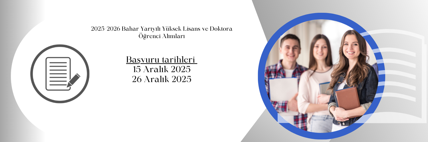 2025-2026 Eğitim-Öğretim Yılı Bahar Yarıyılında Lisansüstü Eğitim Enstitüsü’ne  Yüksek Lisans ve Doktora öğrencisi alımı yapılacaktır.
